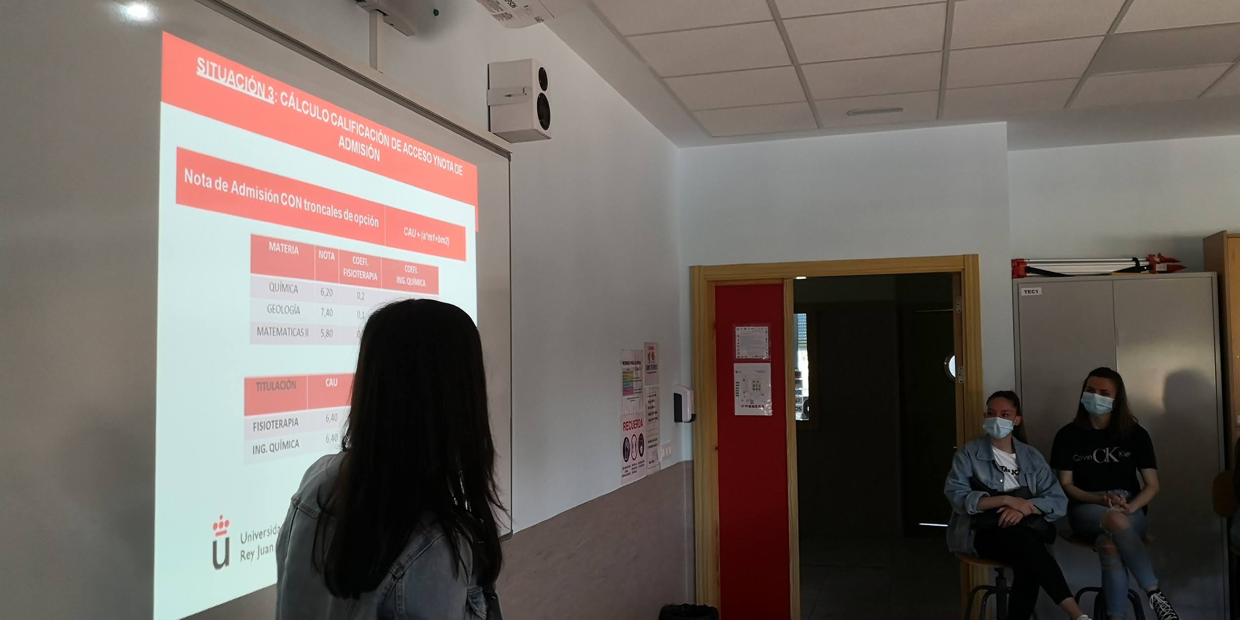 Nuestra auxiliar de Secretaría, María Duro, fue la encargada de explicarles todo lo referente a la solicitud de su recién estrenado título y nuestra Jefa de Estudios, Míriam Torres, lo fue de guiarles en la exposición sobre el desarrollo de la prueba EvAU, las ponderaciones, el cálculo de la nota de corte en el acceso a las carreras que solicitarán, etc. Además, contaron con la presencia y la ayuda de dos antiguos alumnos que ya vivieron esta experiencia el curso pasado, Alejandro Doncel y María Sánchez, quienes se encargaron de responder a todas sus inquietudes acerca de los días de estudio y preparación que llegan ahora, antes de la convocatoria de los exámenes.